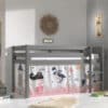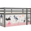 Deze PINO hoogslaper is vervaardigd van massief grenen en is grijs gelakt. De ladder kan zowel links als rechts gemonteerd worden. De lattenbodem is inbegrepen. De allround valbeveiliging, brede treden en goede stabiliteit maken dit bed heel veilig. De ruimte onder het bed kan gebruikt worden om te spelen of als opbergruimte. In het PINO gamma zijn verschillende mogelijkheden beschikbaar om dit bed aan te vullen met een bureau, bibliotheek, commodes, hangplankje of leuke textielset. Bij deze combinatie is een speelgordijn Princess sophie inbegrepen.