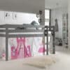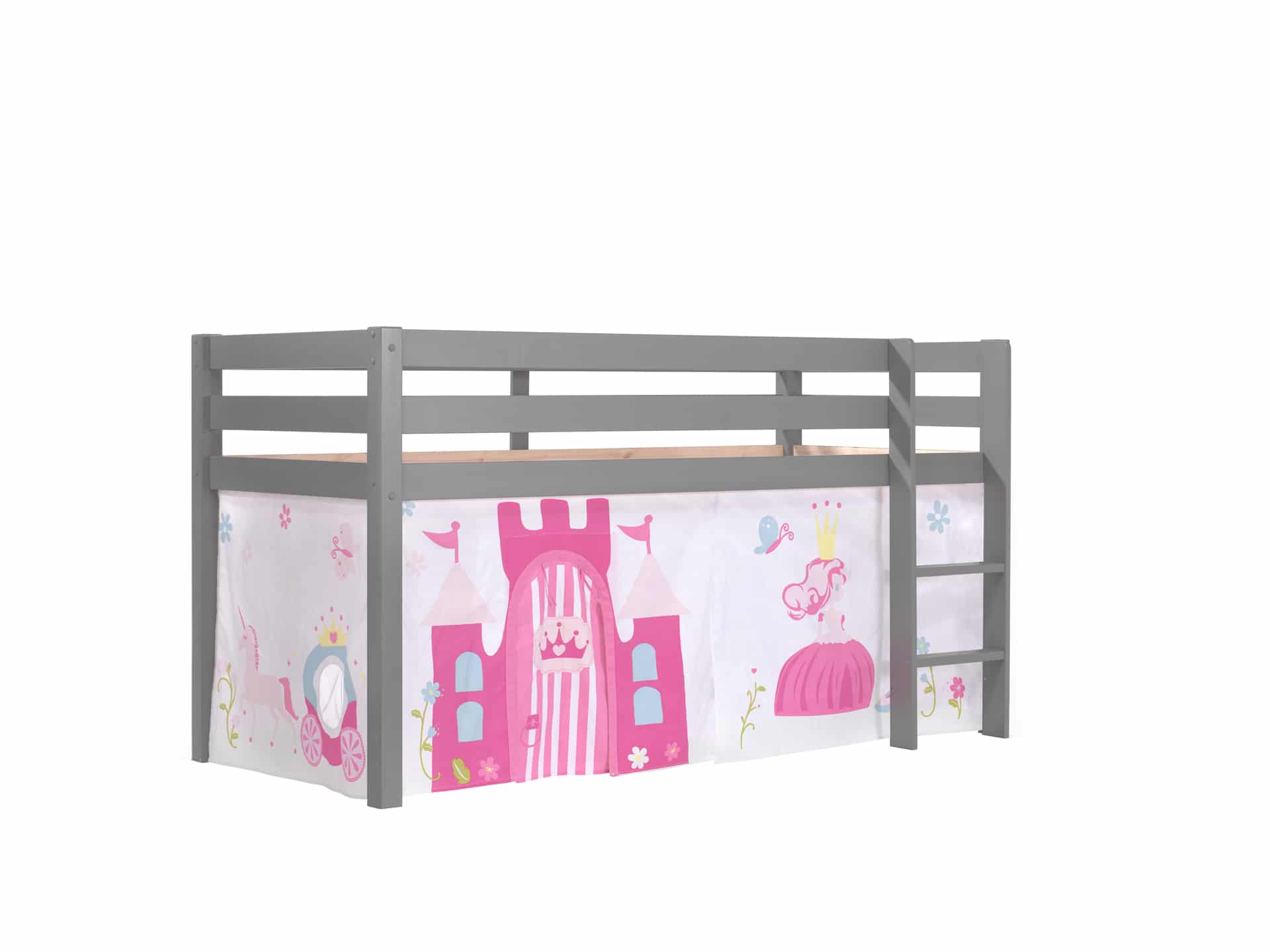 Deze PINO hoogslaper is vervaardigd van massief grenen en is grijs gelakt. De ladder kan zowel links als rechts gemonteerd worden. De lattenbodem is inbegrepen. De allround valbeveiliging, brede treden en goede stabiliteit maken dit bed heel veilig. De ruimte onder het bed kan gebruikt worden om te spelen of als opbergruimte. In het PINO gamma zijn verschillende mogelijkheden beschikbaar om dit bed aan te vullen met een bureau, bibliotheek, commodes, hangplankje of leuke textielset. Bij deze combinatie is een speelgordijn Princess inbegrepen.