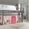 Deze PINO hoogslaper is vervaardigd van massief grenen en is grijs gelakt. De ladder kan zowel links als rechts gemonteerd worden. De lattenbodem is inbegrepen. De allround valbeveiliging, brede treden en goede stabiliteit maken dit bed heel veilig. De ruimte onder het bed kan gebruikt worden om te spelen of als opbergruimte. In het PINO gamma zijn verschillende mogelijkheden beschikbaar om dit bed aan te vullen met een bureau, bibliotheek, commodes, hangplankje of leuke textielset. Bij deze combinatie is een speelgordijn Spring inbegrepen.