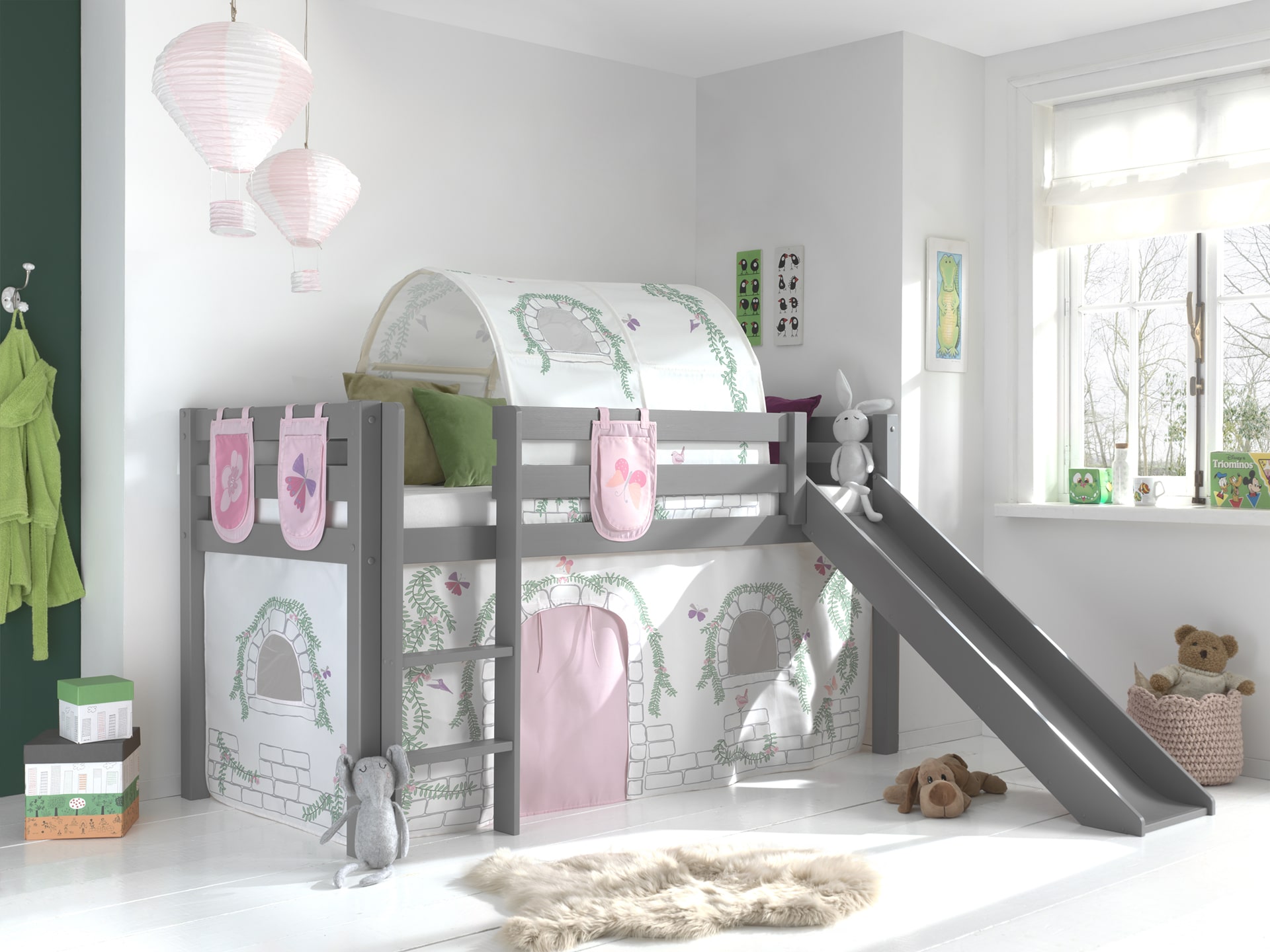 Deze PINO hoogslaper is vervaardigd van massief grenen en is grijs gelakt. Kinderen zijn dol op de glijbaan en ladder die zowel links als rechts gemonteerd kunnen worden. De lattenbodem is inbegrepen. De allround valbeveiliging, brede treden en goede stabiliteit maken dit bed heel veilig. De ruimte onder het bed kan gebruikt worden om te spelen of als opbergruimte. In het PINO gamma zijn verschillende mogelijkheden beschikbaar om dit bed aan te vullen met een bureau, bibliotheek, commodes, hangplankje of leuke textielset. Bij deze combinatie zijn een speelgordijn Birdy, zakjes 3 stuks Birdy en een tunnel Birdy inbegrepen.