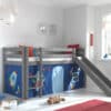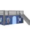 Deze PINO hoogslaper is vervaardigd van massief grenen en is grijs gelakt. Kinderen zijn dol op de glijbaan en ladder die zowel links als rechts gemonteerd kunnen worden. De lattenbodem is inbegrepen. De allround valbeveiliging, brede treden en goede stabiliteit maken dit bed heel veilig. De ruimte onder het bed kan gebruikt worden om te spelen of als opbergruimte. In het PINO gamma zijn verschillende mogelijkheden beschikbaar om dit bed aan te vullen met een bureau, bibliotheek, commodes, hangplankje of leuke textielset. Bij deze combinatie is een speelgordijn Astro inbegrepen.