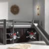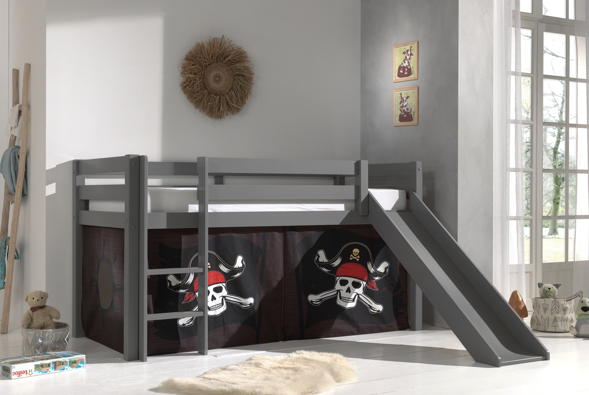 Deze PINO hoogslaper is vervaardigd van massief grenen en is grijs gelakt. Kinderen zijn dol op de glijbaan en ladder die zowel links als rechts gemonteerd kunnen worden. De lattenbodem is inbegrepen. De allround valbeveiliging, brede treden en goede stabiliteit maken dit bed heel veilig. De ruimte onder het bed kan gebruikt worden om te spelen of als opbergruimte. In het PINO gamma zijn verschillende mogelijkheden beschikbaar om dit bed aan te vullen met een bureau, bibliotheek, commodes, hangplankje of leuke textielset. Bij deze combinatie is een speelgordijn caribian Pirates inbegrepen.