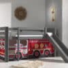 Deze PINO hoogslaper is vervaardigd van massief grenen en is grijs gelakt. Kinderen zijn dol op de glijbaan en ladder die zowel links als rechts gemonteerd kunnen worden. De lattenbodem is inbegrepen. De allround valbeveiliging, brede treden en goede stabiliteit maken dit bed heel veilig. De ruimte onder het bed kan gebruikt worden om te spelen of als opbergruimte. In het PINO gamma zijn verschillende mogelijkheden beschikbaar om dit bed aan te vullen met een bureau, bibliotheek, commodes, hangplankje of leuke textielset. Bij deze combinatie is een speelgordijn fire truck inbegrepen.
