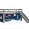 Deze PINO hoogslaper is vervaardigd van massief grenen en is grijs gelakt. Kinderen zijn dol op de glijbaan en ladder die zowel links als rechts gemonteerd kunnen worden. De lattenbodem is inbegrepen. De allround valbeveiliging, brede treden en goede stabiliteit maken dit bed heel veilig. De ruimte onder het bed kan gebruikt worden om te spelen of als opbergruimte. In het PINO gamma zijn verschillende mogelijkheden beschikbaar om dit bed aan te vullen met een bureau, bibliotheek, commodes, hangplankje of leuke textielset. Bij deze combinatie is een speelgordijn Space shuttle inbegrepen.