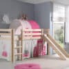 Deze PINO hoogslaper is vervaardigd van massief grenen en is natuur gelakt. Kinderen zijn dol op de glijbaan en ladder die zowel links als rechts gemonteerd kunnen worden. De lattenbodem is inbegrepen. De allround valbeveiliging, brede treden en goede stabiliteit maken dit bed heel veilig. De ruimte onder het bed kan gebruikt worden om te spelen of als opbergruimte. Een speelgordijn en een tunnel princess zijn in deze combinatie reeds inbegrepen