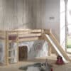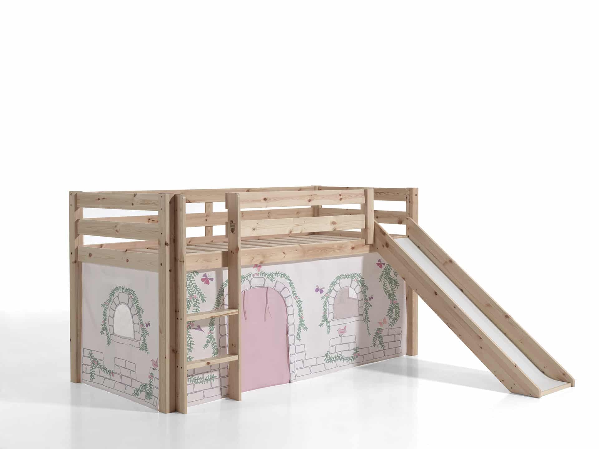 Deze PINO hoogslaper is vervaardigd van massief grenen en is natuur gelakt. Kinderen zijn dol op de glijbaan en ladder die zowel links als rechts gemonteerd kunnen worden. De lattenbodem is inbegrepen. De allround valbeveiliging, brede treden en goede stabiliteit maken dit bed heel veilig. De ruimte onder het bed kan gebruikt worden om te spelen of als opbergruimte. In het PINO gamma zijn verschillende mogelijkheden beschikbaar om dit bed aan te vullen met een bureau, bibliotheek, commodes, hangplankje of leuke textielset. Bij deze combinatie is alvast een speelgordijn Birdy inbegrepen.
