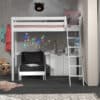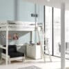 Het PINO mezzanine bed is wit gelakt en gemaakt uit massief Scandinavisch grenen hout. De lattenbodem is inclusief en geschikt voor een matras 90 x 200 cm. Bij deze combinatie zijn een Pino kommode met 2 deuren en een Pino zetelbed inbegrepen.