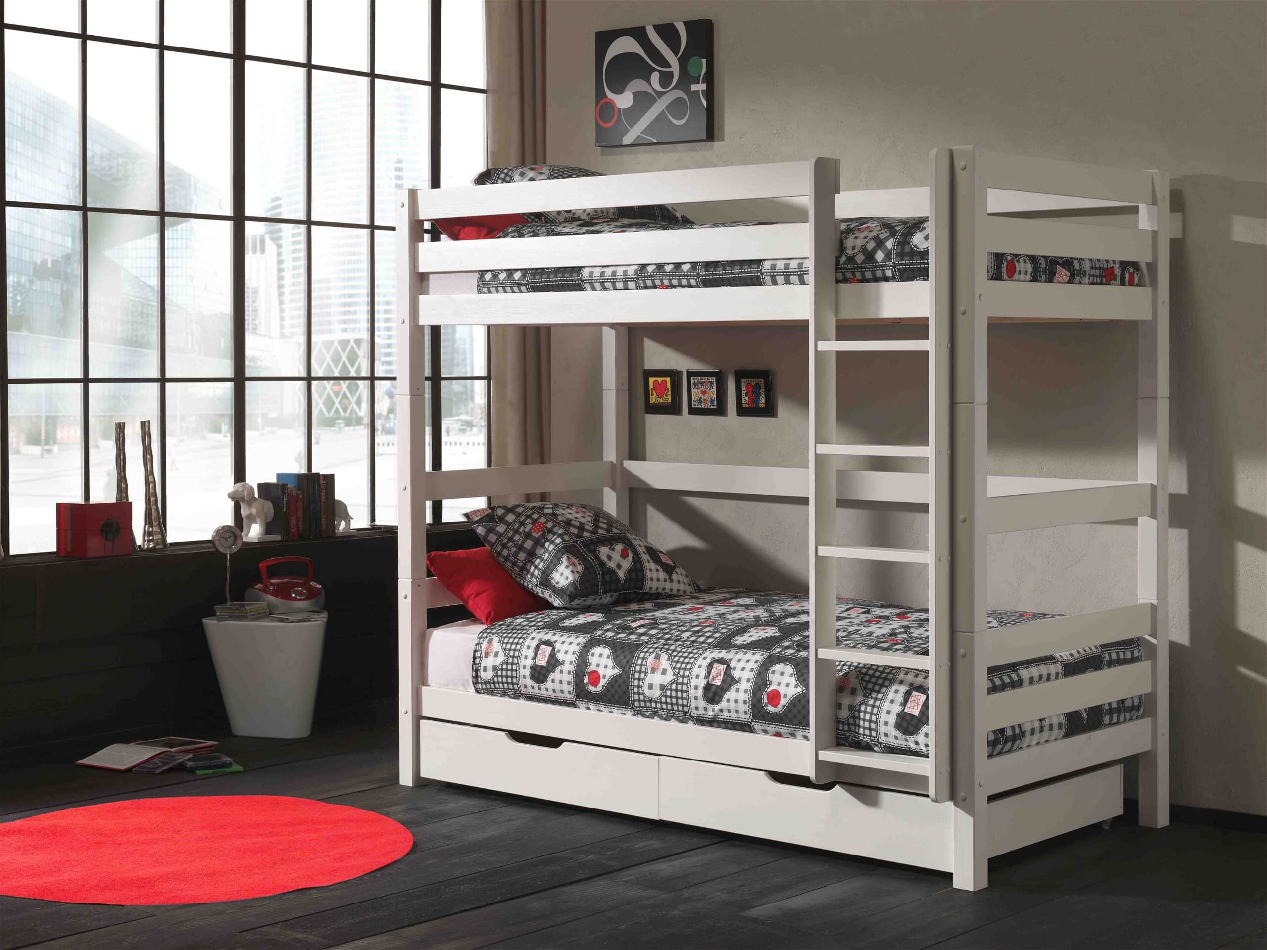Dit PINO stapelbed is wit gelakt en vervaardigd uit massief Scandinavisch grenen hout. Het bed heeft een hoogte van 180 cm. De ladder kan gemonteerd worden aan de linker- en rechterzijde. De lattenbodem is inclusief en is geschikt voor een matras van 90 x 200 cm. Bij deze combinatie zijn 2 opberglades inbegrepen.