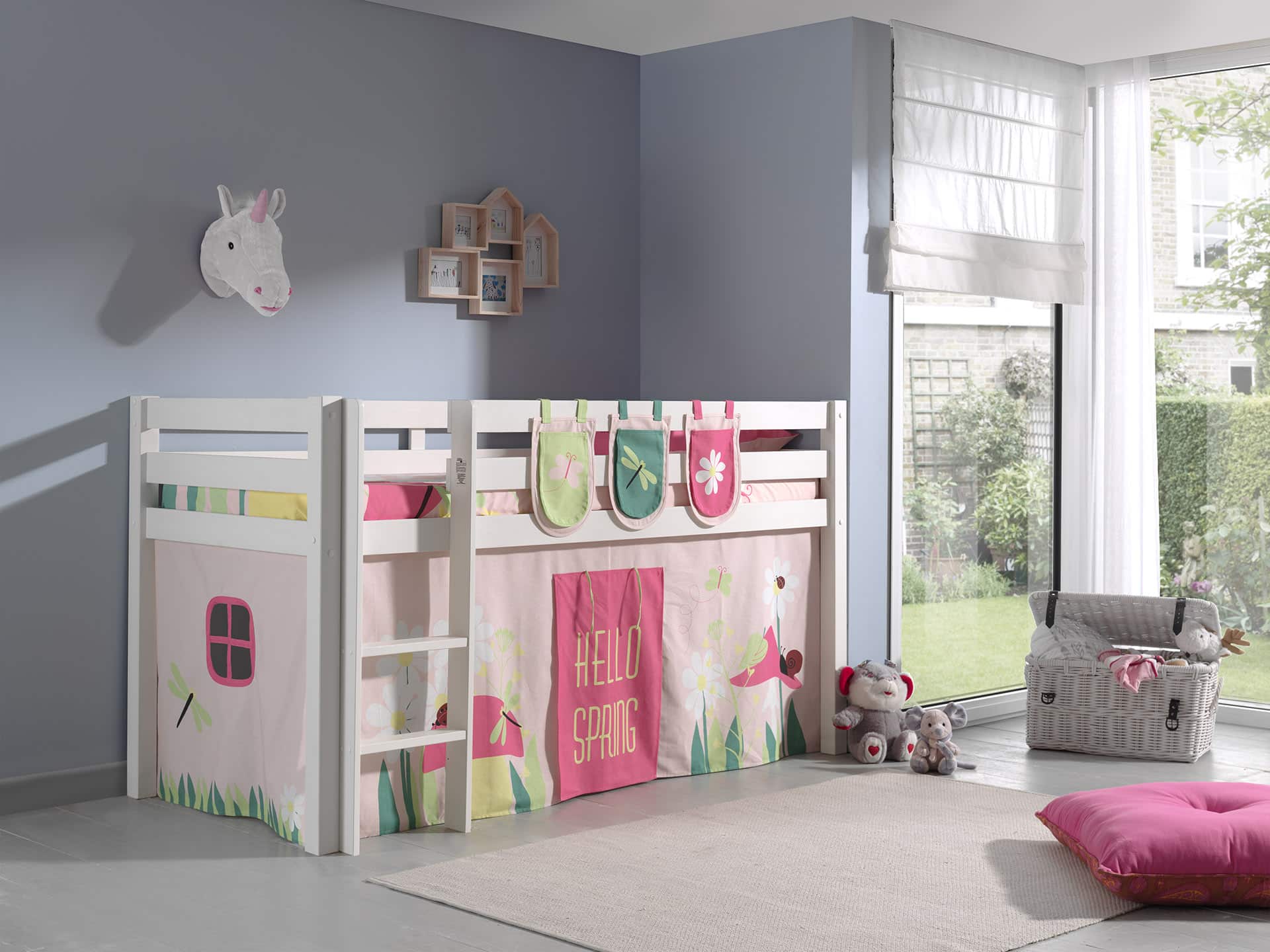 Deze PINO hoogslaper is vervaardigd van massief grenen en is wit gelakt. De ladder kan zowel links als rechts gemonteerd worden. De lattenbodem is inbegrepen. De allround valbeveiliging, brede treden en goede stabiliteit maken dit bed heel veilig. De ruimte onder het bed kan gebruikt worden om te spelen of als opbergruimte. In het PINO gamma zijn verschillende mogelijkheden beschikbaar om dit bed aan te vullen met een bureau, bibliotheek, commodes, hangplankje of leuke textielset. Bij deze combinatie zijn een speelgordijn en 3 zakjes Spring inbegrepen.