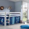 Deze PINO hoogslaper is vervaardigd van massief grenen en is wit gelakt. De ladder kan zowel links als rechts gemonteerd worden. De lattenbodem is inbegrepen. De allround valbeveiliging, brede treden en goede stabiliteit maken dit bed heel veilig. De ruimte onder het bed kan gebruikt worden om te spelen of als opbergruimte. In het PINO gamma zijn verschillende mogelijkheden beschikbaar om dit bed aan te vullen met een bureau, bibliotheek, commodes, hangplankje of leuke textielset. Bij deze combinatie is een speelgordijn Astro inbegrepen.