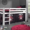 Deze PINO hoogslaper is vervaardigd van massief grenen en is wit gelakt. De ladder kan zowel links als rechts gemonteerd worden. De lattenbodem is inbegrepen. De allround valbeveiliging, brede treden en goede stabiliteit maken dit bed heel veilig. De ruimte onder het bed kan gebruikt worden om te spelen of als opbergruimte. In het PINO gamma zijn verschillende mogelijkheden beschikbaar om dit bed aan te vullen met een bureau, bibliotheek, commodes, hangplankje of leuke textielset. Bij deze combinatie is een speelgordijn Pirates inbegrepen.