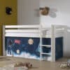 Deze PINO hoogslaper is vervaardigd van massief grenen en is wit gelakt. De ladder kan zowel links als rechts gemonteerd worden. De lattenbodem is inbegrepen. De allround valbeveiliging, brede treden en goede stabiliteit maken dit bed heel veilig. De ruimte onder het bed kan gebruikt worden om te spelen of als opbergruimte. In het PINO gamma zijn verschillende mogelijkheden beschikbaar om dit bed aan te vullen met een bureau, bibliotheek, commodes, hangplankje of leuke textielset. Bij deze combinatie is een speelgordijn Space shuttle inbegrepen.