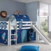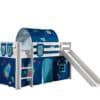 Deze PINO hoogslaper is vervaardigd van massief grenen en is wit gelakt. Kinderen zijn dol op de glijbaan en ladder die zowel links als rechts gemonteerd kunnen worden. De lattenbodem is inbegrepen. De allround valbeveiliging, brede treden en goede stabiliteit maken dit bed heel veilig. De ruimte onder het bed kan gebruikt worden om te spelen of als opbergruimte. In het PINO gamma zijn verschillende mogelijkheden beschikbaar om dit bed aan te vullen met een bureau, bibliotheek, commodes, hangplankje of leuke textielset. Bij deze combinatie zijn een speelgordijn Astro, 3 zakjes Astro en een tunnel Astro inbegrepen.