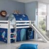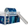 Deze PINO hoogslaper is vervaardigd van massief grenen en is wit gelakt. Kinderen zijn dol op de glijbaan en ladder die zowel links als rechts gemonteerd kunnen worden. De lattenbodem is inbegrepen. De allround valbeveiliging, brede treden en goede stabiliteit maken dit bed heel veilig. De ruimte onder het bed kan gebruikt worden om te spelen of als opbergruimte. In het PINO gamma zijn verschillende mogelijkheden beschikbaar om dit bed aan te vullen met een bureau, bibliotheek, commodes, hangplankje of leuke textielset. Bij deze combinatie zijn een speelgordijn Astro en een tunnel Astro inbegrepen.