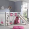 Deze PINO hoogslaper is vervaardigd van massief grenen en is wit gelakt. Kinderen zijn dol op de glijbaan en ladder die zowel links als rechts gemonteerd kunnen worden. De lattenbodem is inbegrepen. De allround valbeveiliging, brede treden en goede stabiliteit maken dit bed heel veilig. De ruimte onder het bed kan gebruikt worden om te spelen of als opbergruimte. In het PINO gamma zijn verschillende mogelijkheden beschikbaar om dit bed aan te vullen met een bureau, bibliotheek, commodes, hangplankje of leuke textielset. Bij deze combinatie zijn alvast een speelgordijn Princess en 3 zakjes Princess inbegrepen.