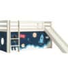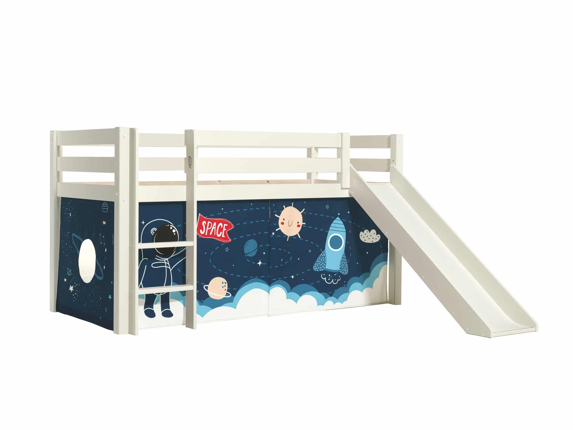Deze PINO hoogslaper is vervaardigd van massief grenen en is wit gelakt. Kinderen zijn dol op de glijbaan en ladder die zowel links als rechts gemonteerd kunnen worden. De lattenbodem is inbegrepen. De allround valbeveiliging, brede treden en goede stabiliteit maken dit bed heel veilig. De ruimte onder het bed kan gebruikt worden om te spelen of als opbergruimte. In het PINO gamma zijn verschillende mogelijkheden beschikbaar om dit bed aan te vullen met een bureau, bibliotheek, commodes, hangplankje of leuke textielset. Bij deze combinatie is een speelgordijn Space shuttle inbegrepen.