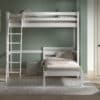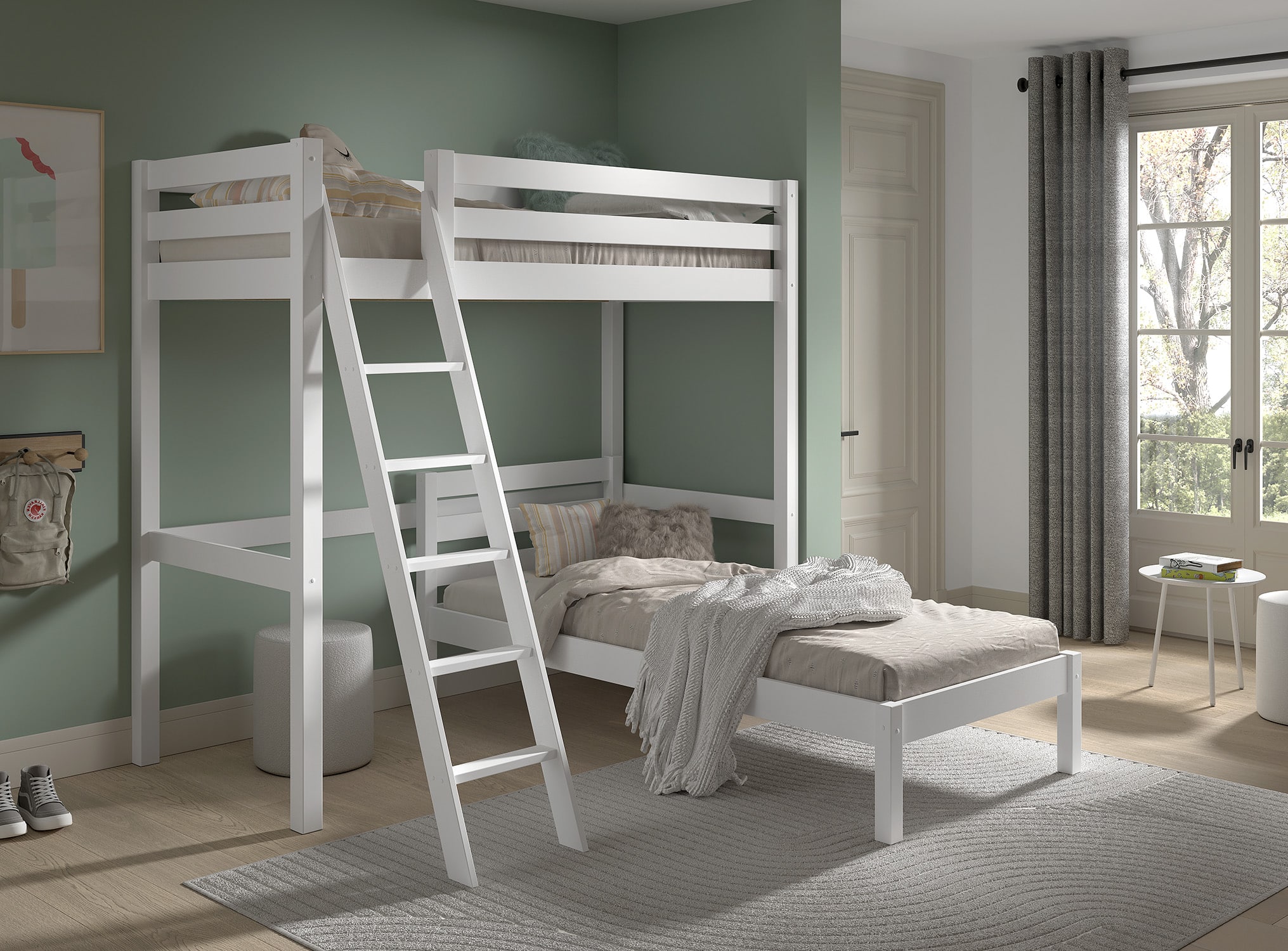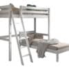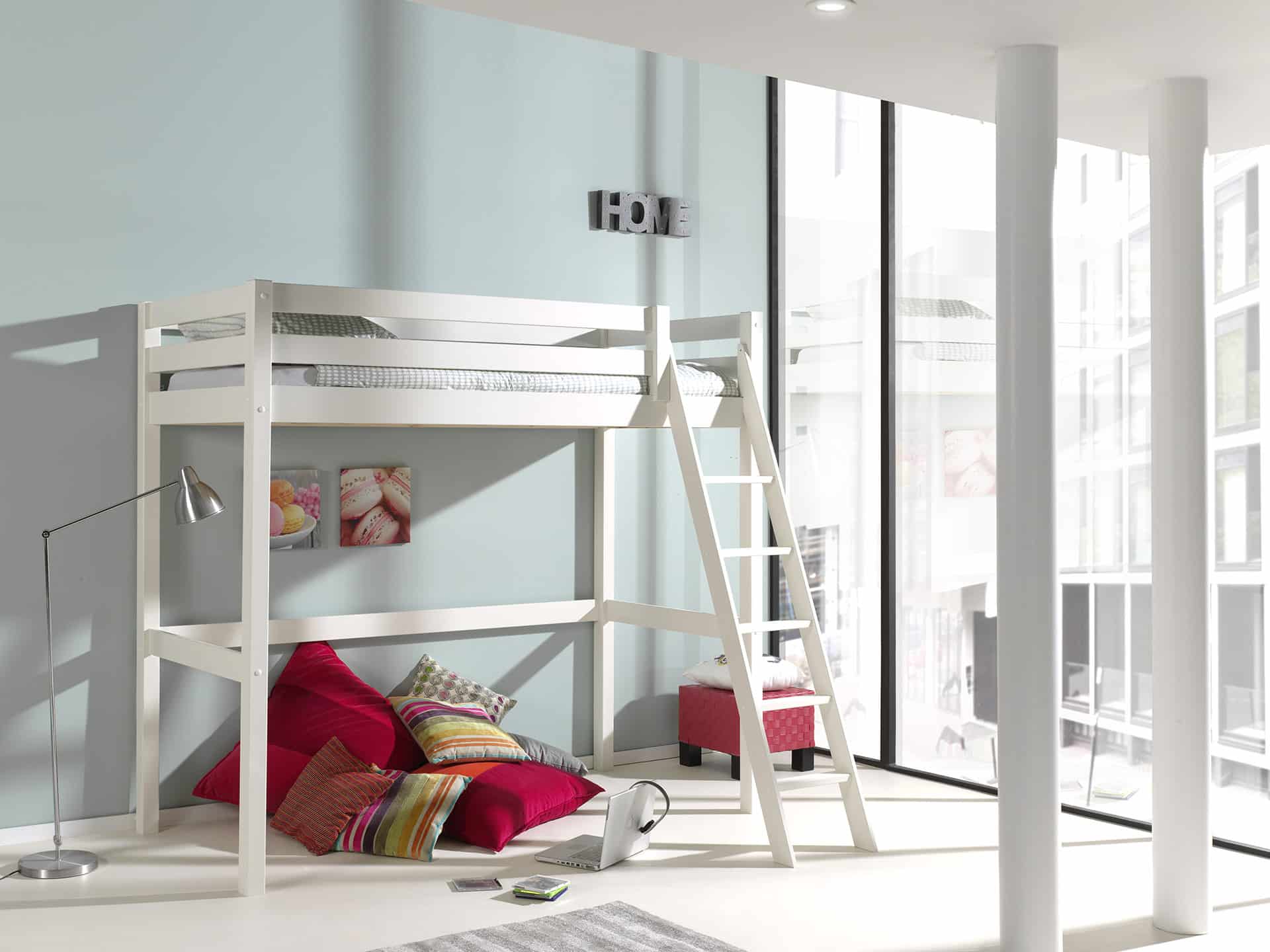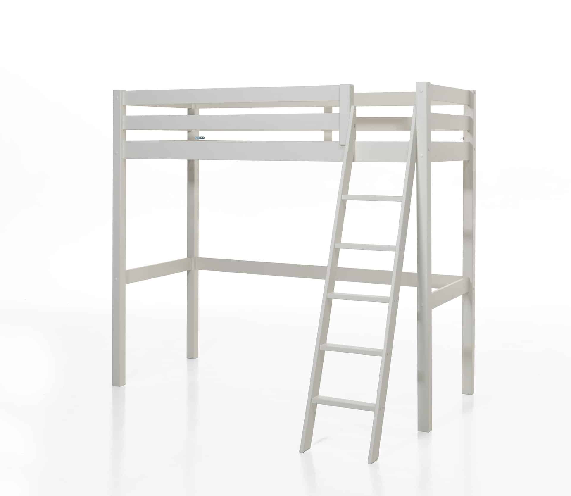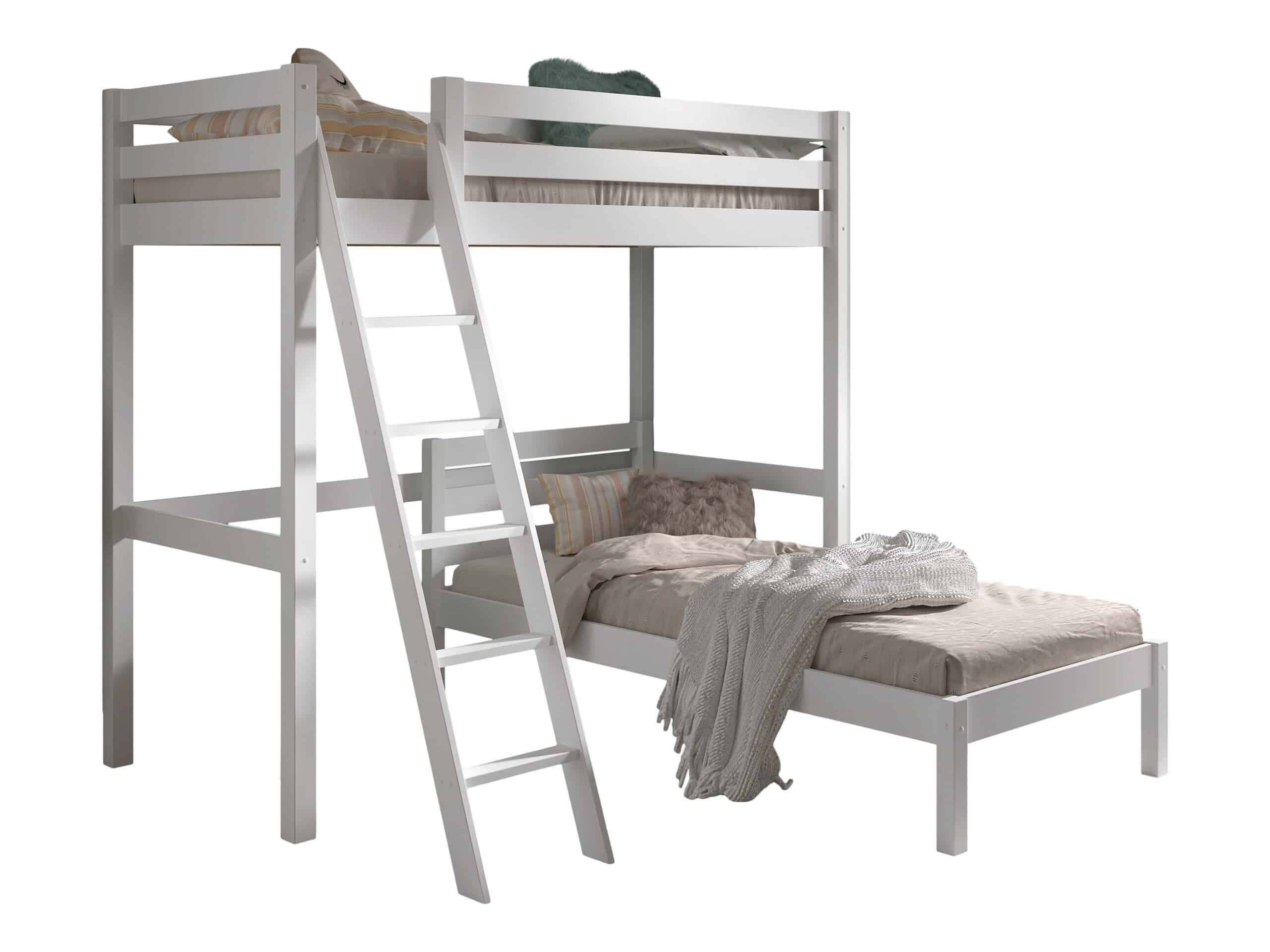Dit mezzanine bed (90 x 200 cm) in wit uit de PINO collectie is in combinatie met het enkel bed (90 x 200 cm) dat onderaan wordt geplaatst een echte ruimtebesparende optie voor al wie daar nood aan heeft. Deze combinatie biedt ruimte voor 2 slaapplaatsen. De ruimte onder het bed kan praktisch ingericht worden en kan ingezet worden als studeer-, lees- of speelruimte.