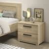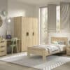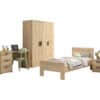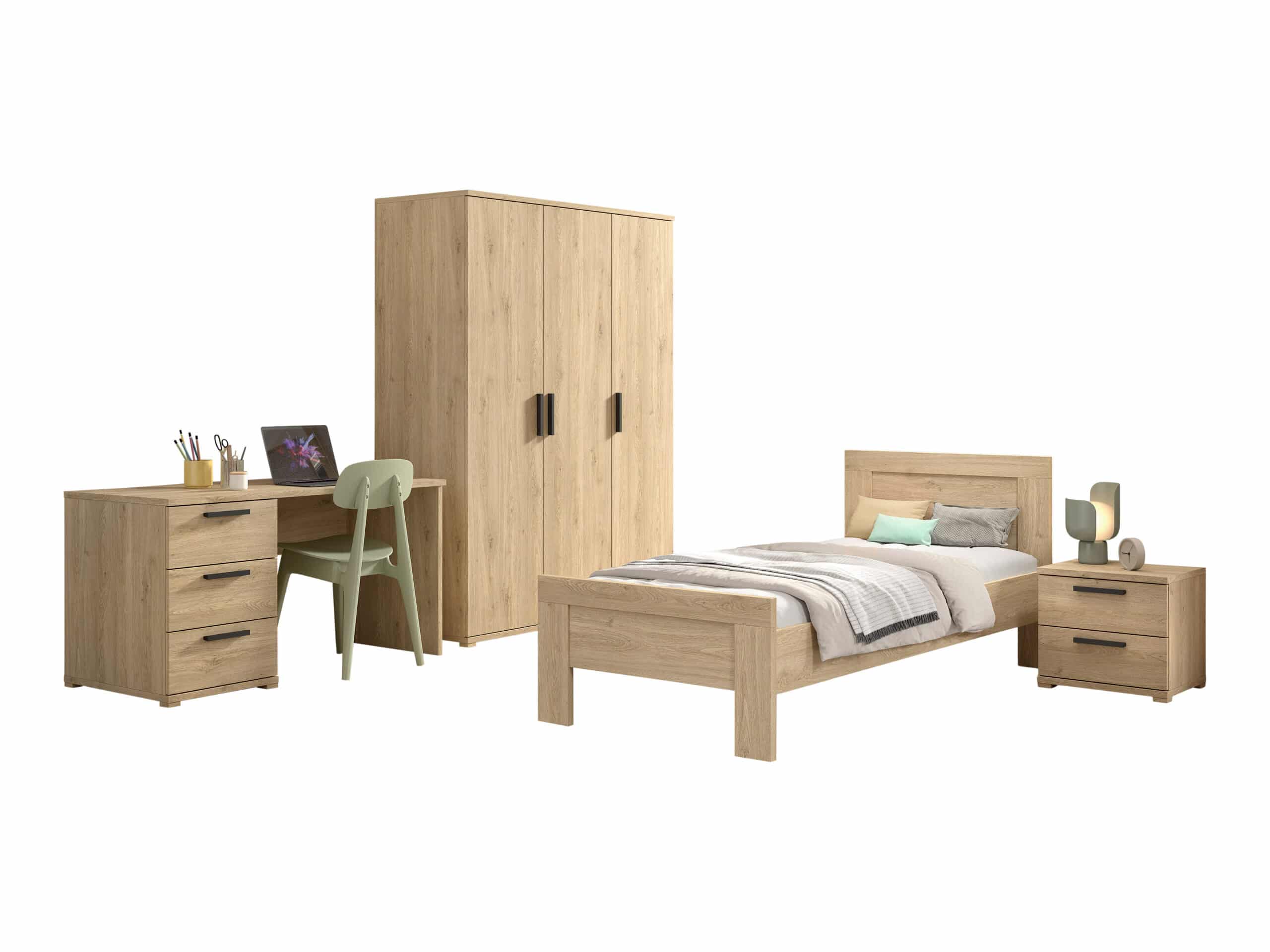 Dit bed (90 x 200 cm) uit de veelzijdige SAM collectie is de perfecte oplossing voor iedereen die op zoek is naar modern, stijlvol en praktisch meubilair. Met een warme houtlook en minimalistisch design is dit bed ideaal voor zowel kinderen als jongeren. Gemaakt van duurzame materialen die tegen een stootje kunnen, zodat het bed jarenlang meegaat. De lattenbodem is niet inbegrepen. De nachttafel beschikt over 2 ruime lades. De 3-deurs kleerkast biedt voldoende opbergruimte en bestaat aan de linkerzijde uit 2 legplanken en een kledingrail. Achter de rechterdeur bevinden zich 4 legplanken. Het bureau heeft een ruim werkoppervlak voor schoolwerk of creatieve projecten. Ook zijn er 3 lades voorzien zodat alle schoolmateriaal en persoonlijke spullen netjes opgeborgen kunnen worden.