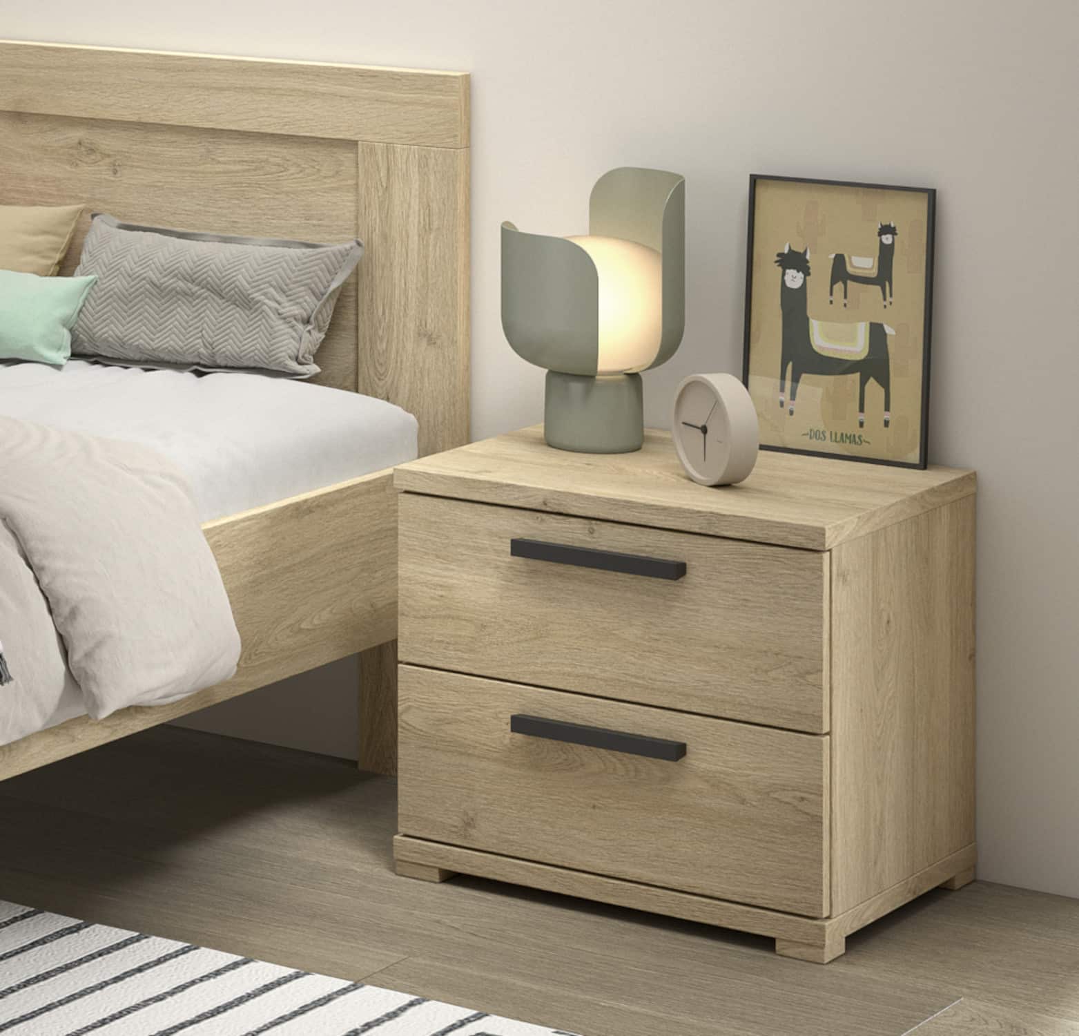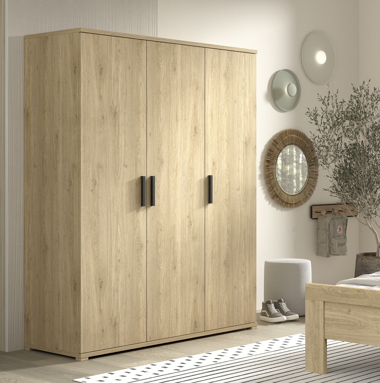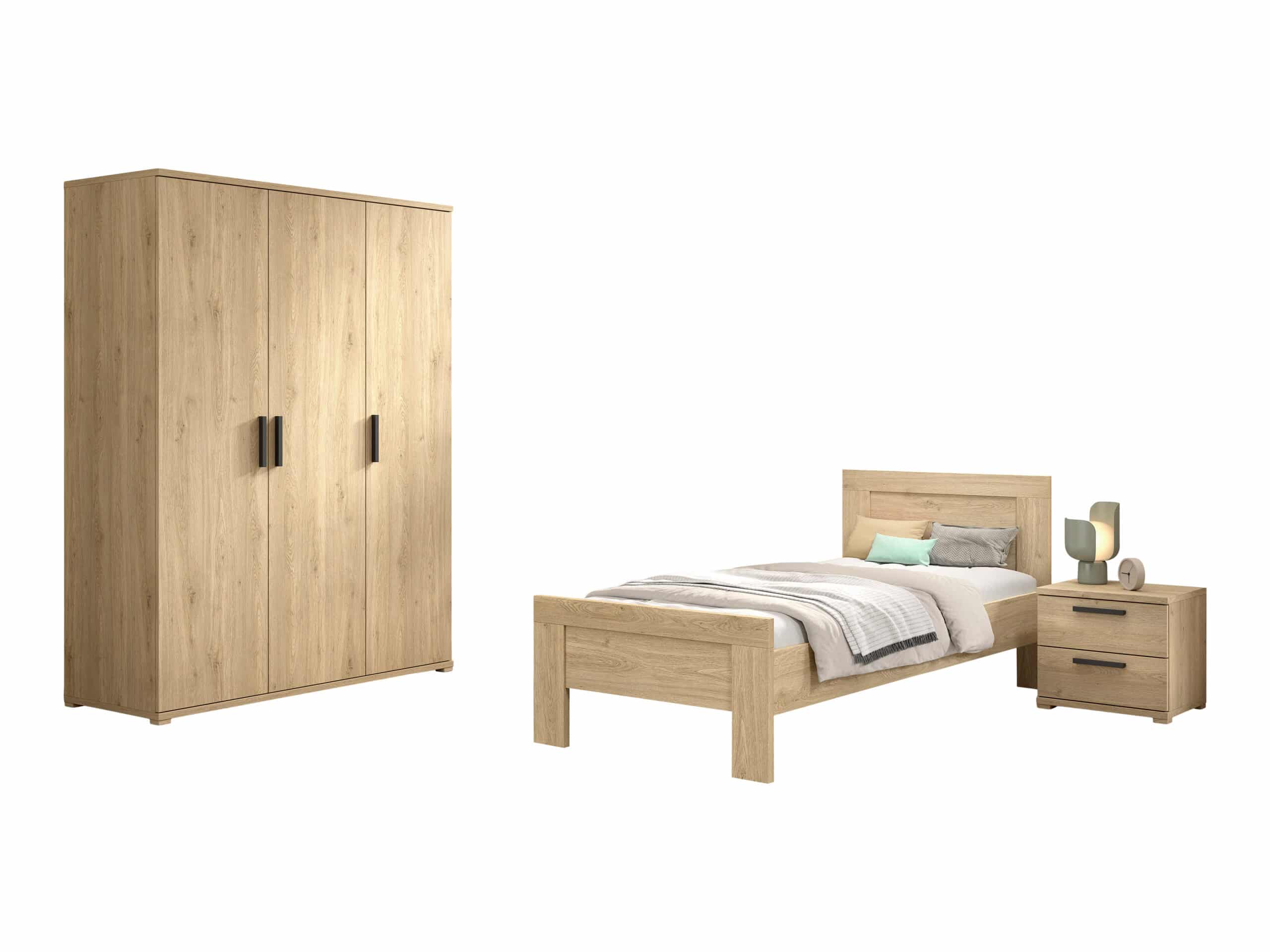 Dit bed (90 x 200 cm) uit de veelzijdige SAM collectie is de perfecte oplossing voor iedereen die op zoek is naar modern, stijlvol en praktisch meubilair. Met een warme houtlook en minimalistisch design is dit bed ideaal voor zowel kinderen als jongeren. Gemaakt van duurzame materialen die tegen een stootje kunnen, zodat het bed jarenlang meegaat. De lattenbodem is niet inbegrepen. De nachttafel beschikt over 2 ruime lades. De 3-deurs kleerkast biedt voldoende opbergruimte en bestaat aan de linkerzijde uit 2 legplanken en een kledingrail. Achter de rechterdeur bevinden zich 4 legplanken.