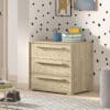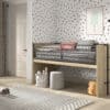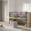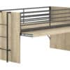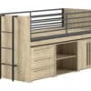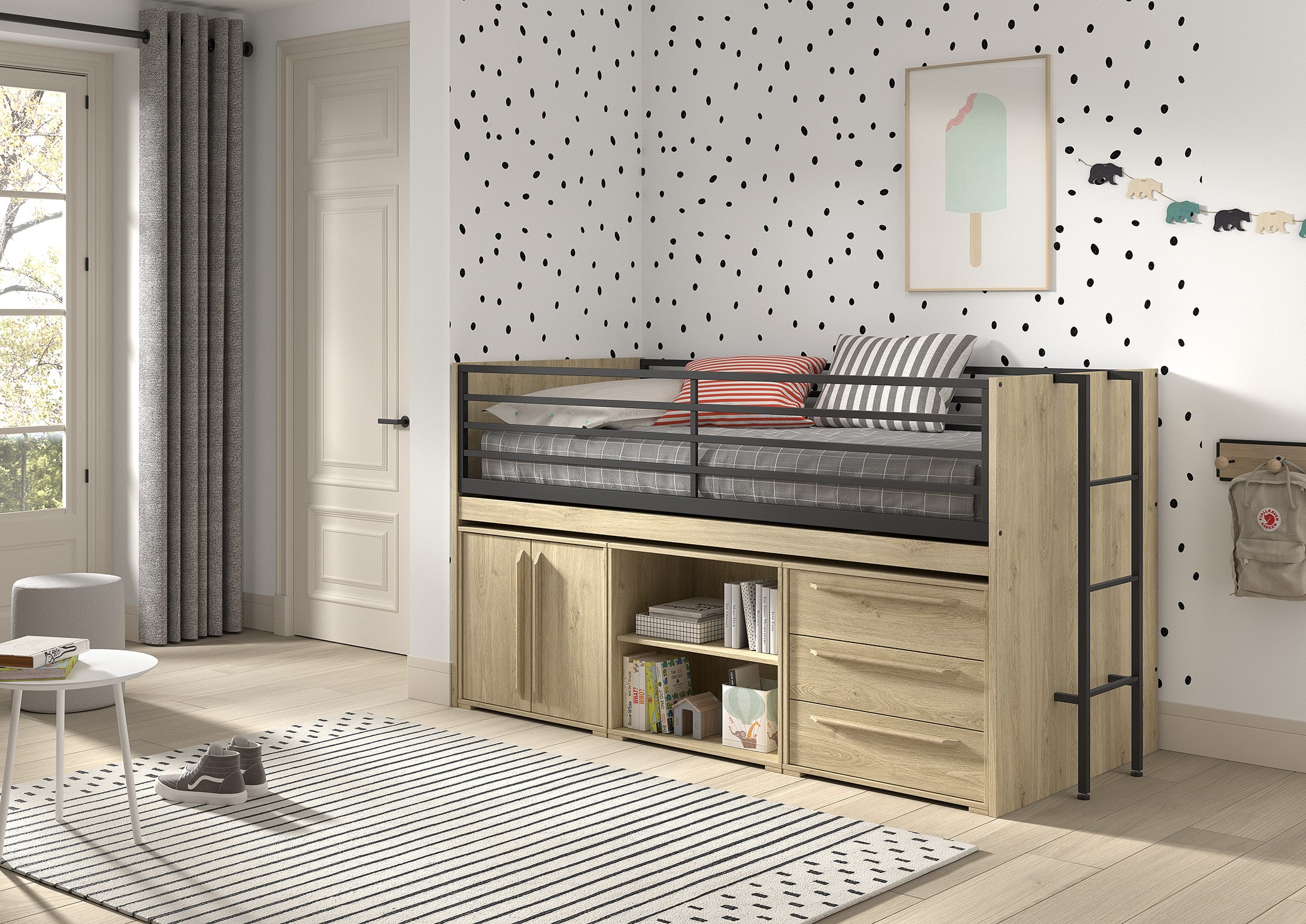 Deze hoogslaper (90 x 200 cm) van de SAM collectie in een trendy eiken uitvoering heeft in combinatie met de zwarten metalen accenten een eigentijdse uitstraling. Het bed is een slimme en stijlvolle optie voor al wie op zoek is naar ruimtebesparende slaapopties. Het werd ontworpen met oog voor detail en functionaliteit. Het uitschuifbare bureau heeft een heel ruim oppervlak waardoor het perfect is voor het maken van huiswerk of andere creatieve bezigheden. Het bed beschikt over een uitvalbeveiliging en een stevige ladder die zowel links als rechts kan bevestigd worden. De ruimte onderaan het bureau wordt benut als extra opbergruimte door het plaatsen van een open boekenkast, een commode met 2 deuren en een commode met 3 laden. Deze kasten bieden voldoende ruimte voor het opbergen van boeken, schoolmateriaal, speelgoed,… of voor het uitstallen van persoonlijke spullen.