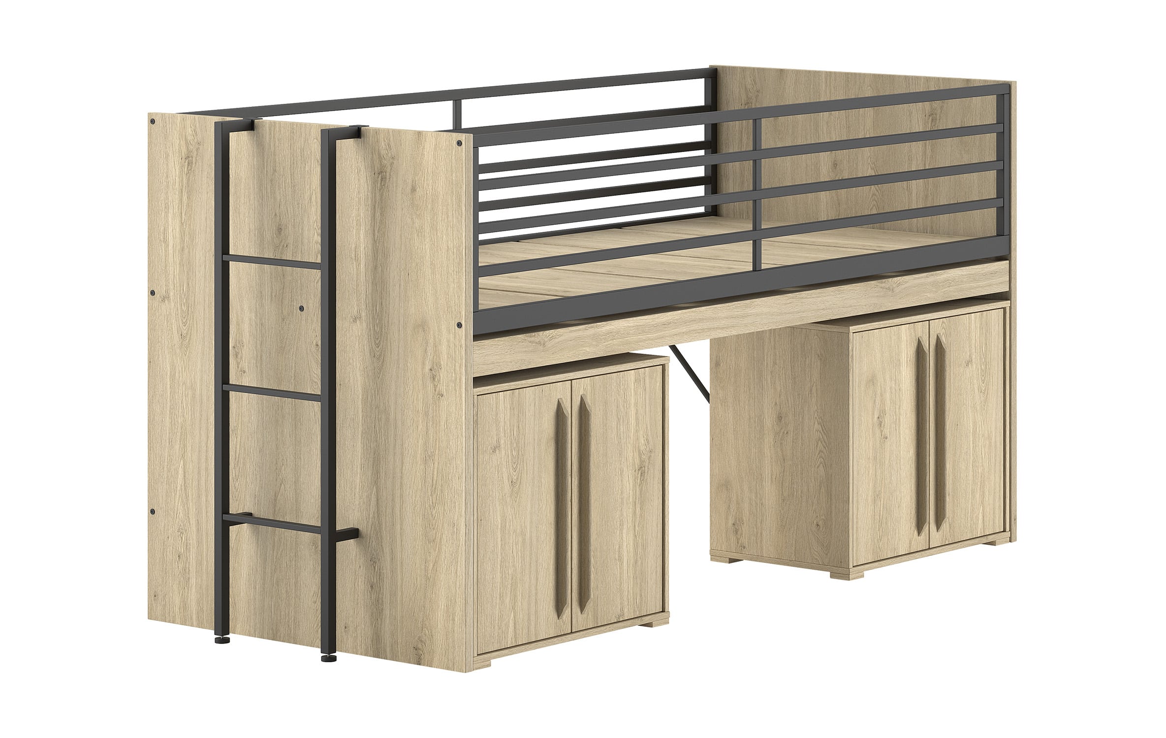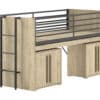 Deze hoogslaper (90 x 200 cm) van de SAM collectie in een trendy eiken uitvoering heeft in combinatie met de zwarten metalen accenten een eigentijdse uitstraling. Het bed is een slimme en stijlvolle optie voor al wie op zoek is naar ruimtebesparende slaapopties. Het werd ontworpen met oog voor detail en functionaliteit. Het uitschuifbare bureau heeft een heel ruim oppervlak waardoor het perfect is voor het maken van huiswerk of andere creatieve bezigheden. Het bed beschikt over een uitvalbeveiliging en een stevige ladder die zowel links als rechts kan bevestigd worden. De ruimte onderaan het bureau wordt benut als extra opbergruimte door het plaatsen van 2 commodes. Deze commodes met 2 deuren beschikken over 1 legplank binnenin en bieden voldoende ruimte voor het opbergen van boeken, schoolmateriaal, speelgoed,…