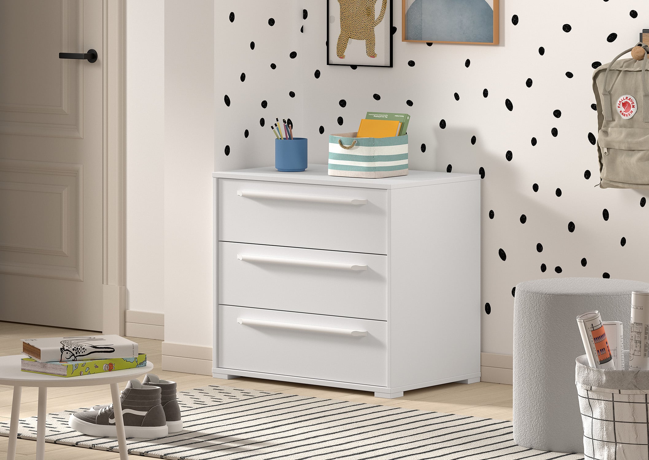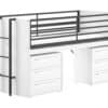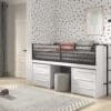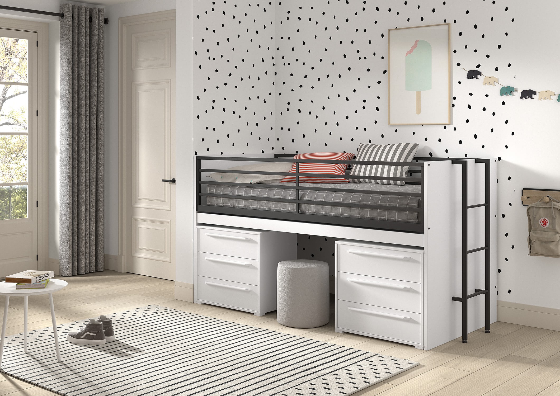 Deze hoogslaper (90 x 200 cm) van de SAM collectie in een witte uitvoering heeft in combinatie met de zwarten metalen accenten een eigentijdse uitstraling. Het bed is een slimme en stijlvolle optie voor al wie op zoek is naar ruimtebesparende slaapopties. Het werd ontworpen met oog voor detail en functionaliteit. Het uitschuifbare bureau heeft een heel ruim oppervlak waardoor het perfect is voor het maken van huiswerk of andere creatieve bezigheden. Het bed beschikt over een uitvalbeveiliging en een stevige ladder die zowel links als rechts kan bevestigd worden. De ruimte onderaan het bureau wordt benut als extra opbergruimte door het plaatsen van 2 commodes. Deze commodes met 3 laden bieden voldoende ruimte voor het opbergen van boeken, schoolmateriaal, speelgoed,…
