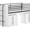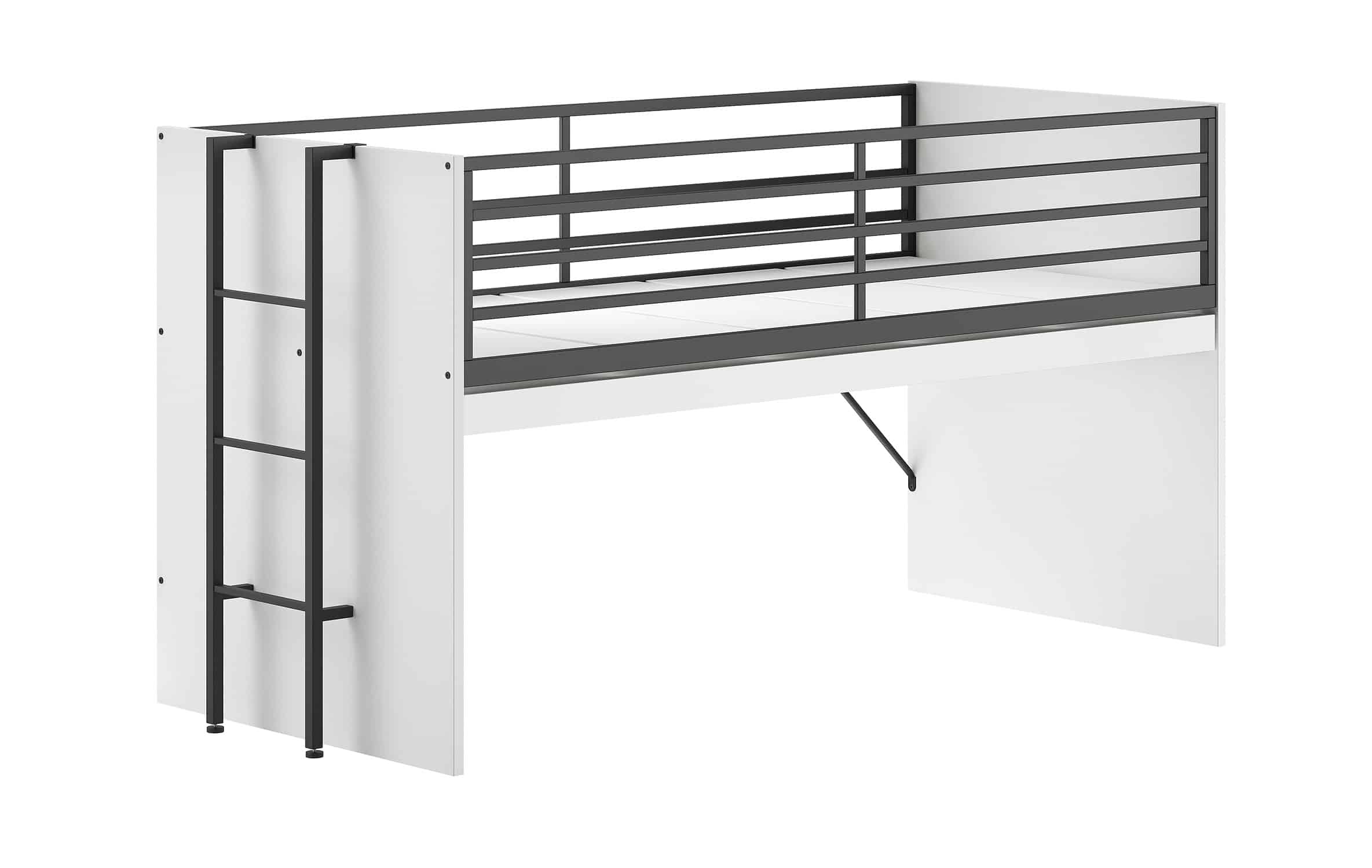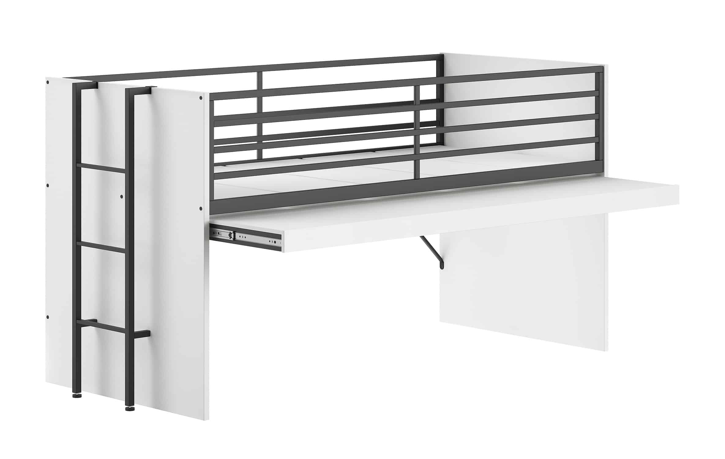 Deze hoogslaper (90 x 200 cm) van de SAM collectie in een witte uitvoering heeft in combinatie met de zwarten metalen accenten een eigentijdse uitstraling. Het bed is een slimme en stijlvolle optie voor al wie op zoek is naar ruimtebesparende slaapopties. Het werd ontworpen met oog voor detail en functionaliteit. Het uitschuifbare bureau heeft een heel ruim oppervlak waardoor het perfect is voor het maken van huiswerk of andere creatieve bezigheden. Het bed beschikt over een uitvalbeveiliging en een stevige ladder die zowel links als rechts kan bevestigd worden. De ruimte onderaan het bureau wordt benut als extra opbergruimte door het plaatsen van 2 commodes. Deze commodes met 2 deuren beschikken over 1 legplank binnenin en bieden voldoende ruimte voor het opbergen van boeken, schoolmateriaal, speelgoed,…
