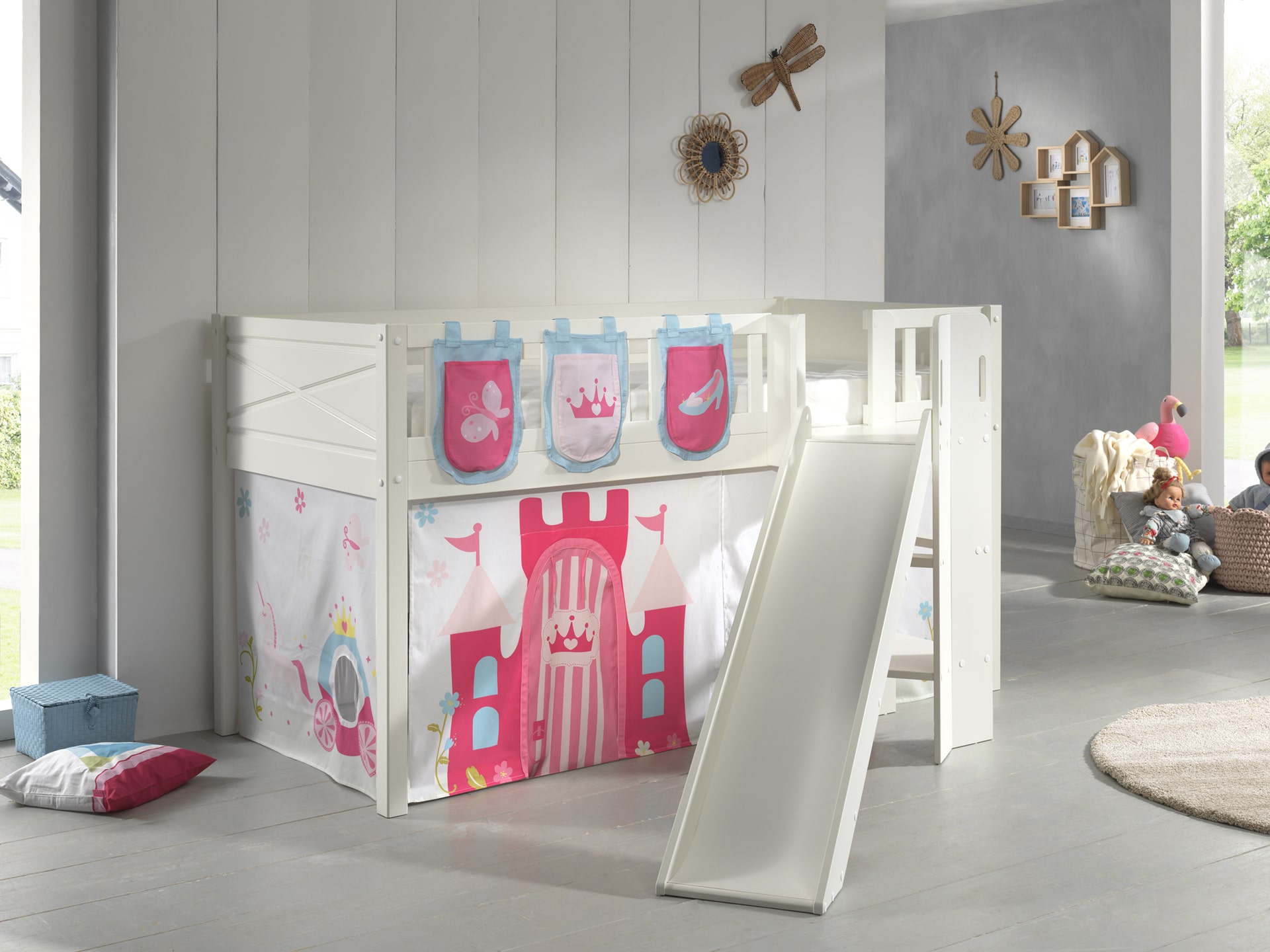 De SCOTT halfhoogslaper (90 x 200 cm) met glijbaan in wit is vervaardigd uit massief Scandinavisch grenen. Het is niet alleen een comfortabele slaapplek, maar geeft ook eindeloos speelplezier. Er kunnen optioneel lades toegevoegd worden die kunnen ingezet worden als opbergruimte voor speelgoed, boeken, kussens,… Dit maakt het ideaal voor kamers waar ruimtebesparing essentieel is. De textielset in het thema PRINCESS is de perfecte aanvulling hierop. Kinderen genieten met volle teugen van hun verborgen speelparadijs onder hun bed!