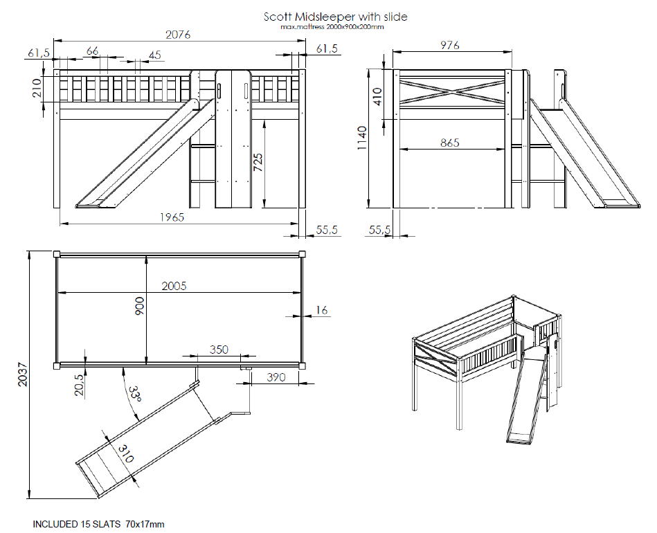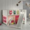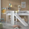 De SCOTT halfhoogslaper (90 x 200 cm) met glijbaan in wit is vervaardigd uit massief Scandinavisch grenen. Het is niet alleen een comfortabele slaapplek, maar geeft ook eindeloos speelplezier. Er kunnen optioneel lades toegevoegd worden die kunnen ingezet worden als opbergruimte voor speelgoed, boeken, kussens,… Dit maakt het ideaal voor kamers waar ruimtebesparing essentieel is. De textielset in het thema SPRING is de perfecte aanvulling hierop. Kinderen genieten met volle teugen van hun verborgen speelparadijs onder hun bed!