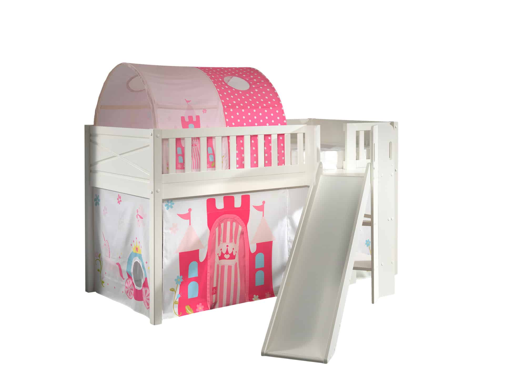De SCOTT halfhoogslaper (90 x 200 cm) met glijbaan in wit is vervaardigd uit massief Scandinavisch grenen. Het is niet alleen een comfortabele slaapplek, maar geeft ook eindeloos speelplezier. Er kunnen optioneel lades toegevoegd worden die kunnen ingezet worden als opbergruimte voor speelgoed, boeken, kussens,… Dit maakt het ideaal voor kamers waar ruimtebesparing essentieel is. De textielset in het thema PRINCESS is de perfecte aanvulling hierop. Kinderen genieten met volle teugen van hun verborgen speelparadijs onder hun bed!