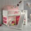 De SCOTT halfhoogslaper (90 x 200 cm) met glijbaan in wit is vervaardigd uit massief Scandinavisch grenen. Het is niet alleen een comfortabele slaapplek, maar geeft ook eindeloos speelplezier. Er kunnen optioneel lades toegevoegd worden die kunnen ingezet worden als opbergruimte voor speelgoed, boeken, kussens,… Dit maakt het ideaal voor kamers waar ruimtebesparing essentieel is. De textielset in het thema SPRING is de perfecte aanvulling hierop. Kinderen genieten met volle teugen van hun verborgen speelparadijs onder hun bed!