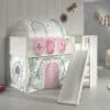 De SCOTT halfhoogslaper (90 x 200 cm) met glijbaan in wit is vervaardigd uit massief Scandinavisch grenen. Het is niet alleen een comfortabele slaapplek, maar geeft ook eindeloos speelplezier. Er kunnen optioneel lades toegevoegd worden die kunnen ingezet worden als opbergruimte voor speelgoed, boeken, kussens,… Dit maakt het ideaal voor kamers waar ruimtebesparing essentieel is. De textielset in het thema BIRDY is de perfecte aanvulling hierop. Kinderen genieten met volle teugen van hun verborgen speelparadijs onder hun bed!