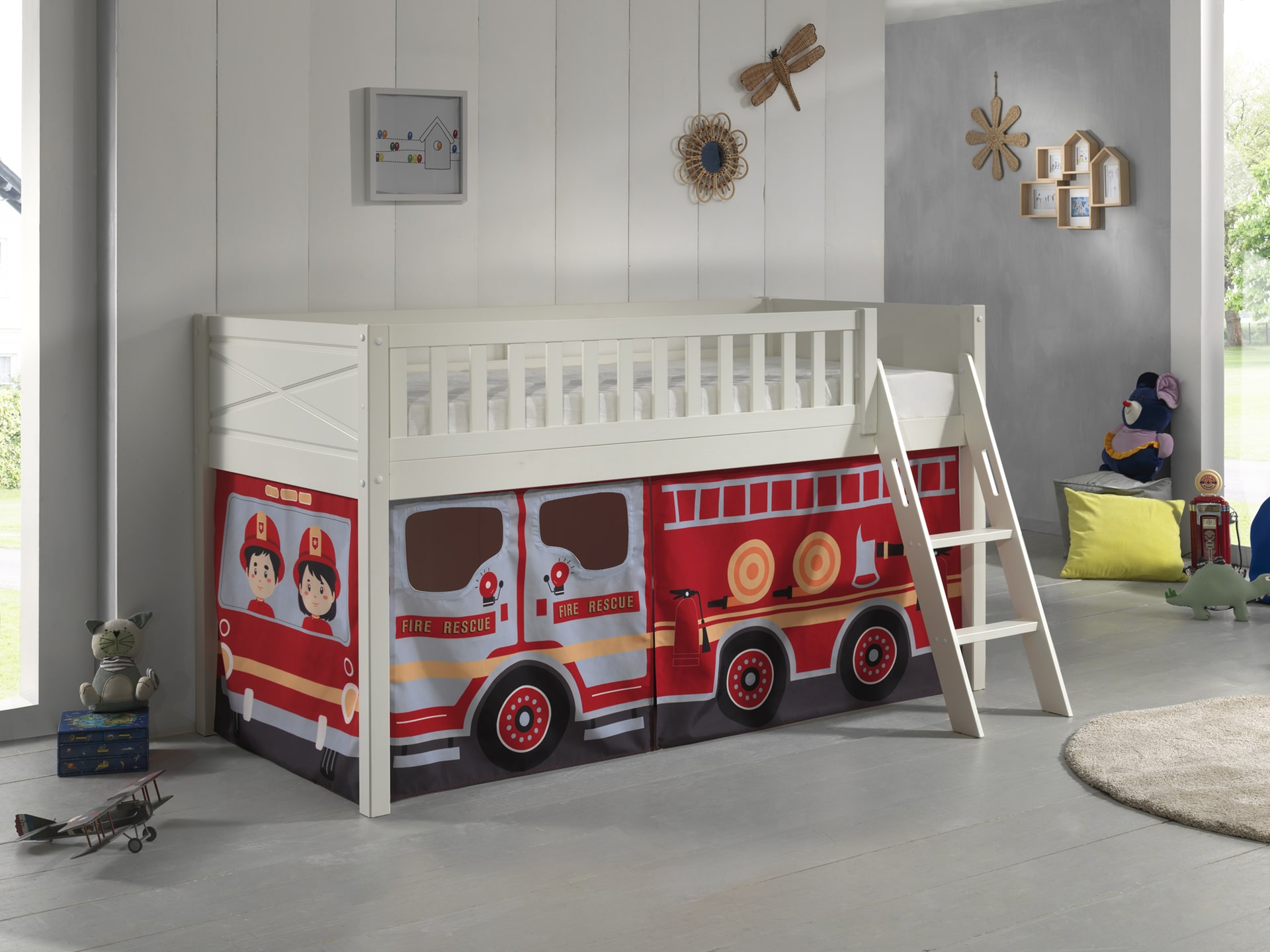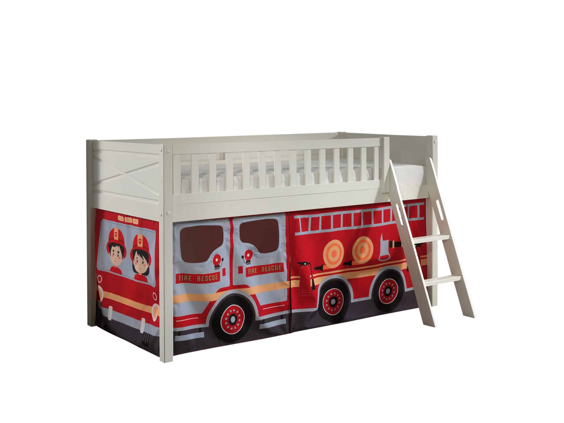 De SCOTT halfhoogslaper (90 x 200 cm) met ladder in wit is vervaardigd uit massief Scandinavisch grenen. Het is niet alleen een comfortabele slaapplek, maar geeft ook eindeloos speelplezier. Er kunnen optioneel lades toegevoegd worden die kunnen ingezet worden als opbergruimte voor speelgoed, boeken, kussens,… Dit maakt het ideaal voor kamers waar ruimtebesparing essentieel is. Het speelgordijn in het thema FIRE TRUCK is de perfecte aanvulling hierop. Kinderen genieten met volle teugen van hun verborgen speelparadijs onder hun bed!