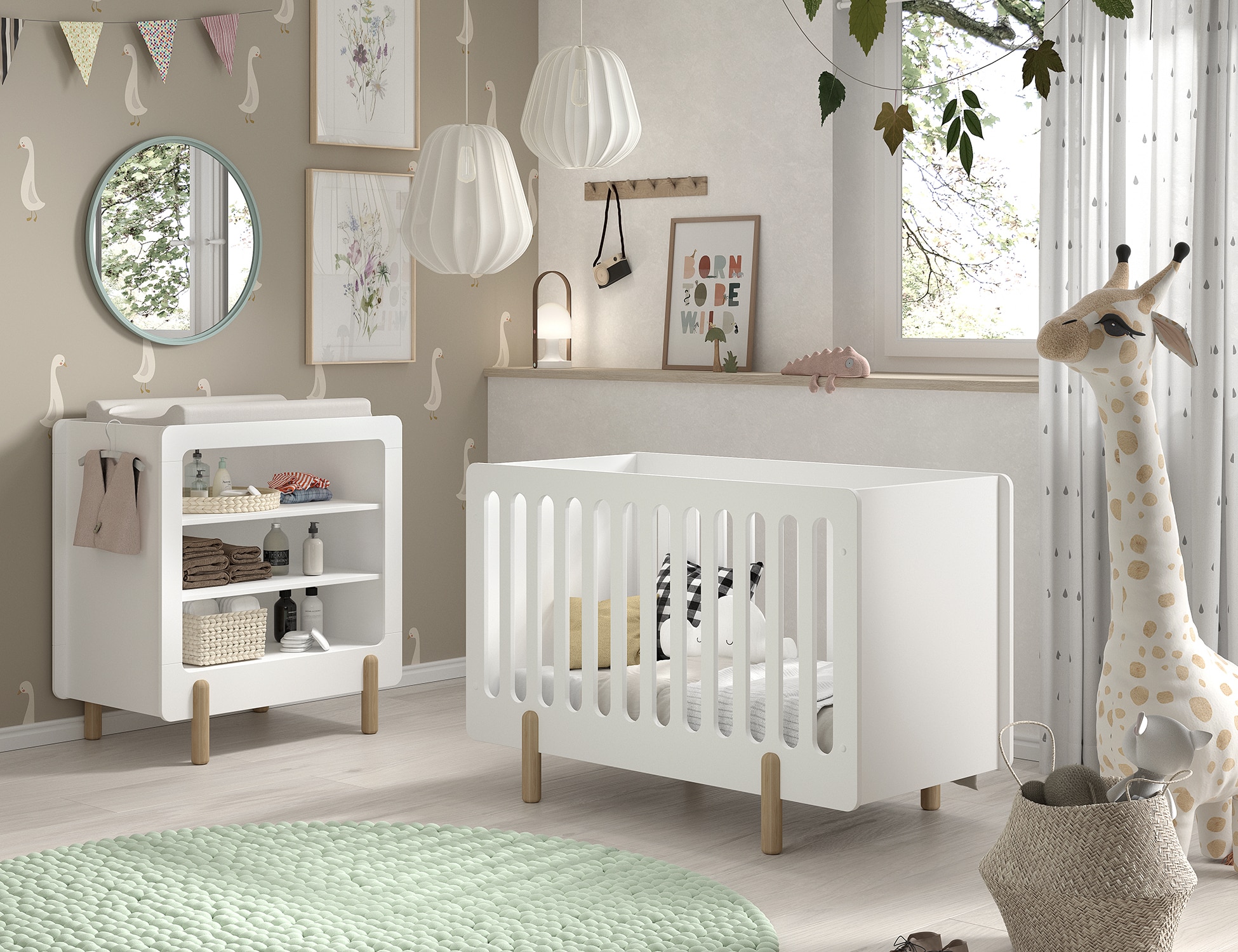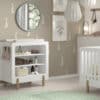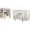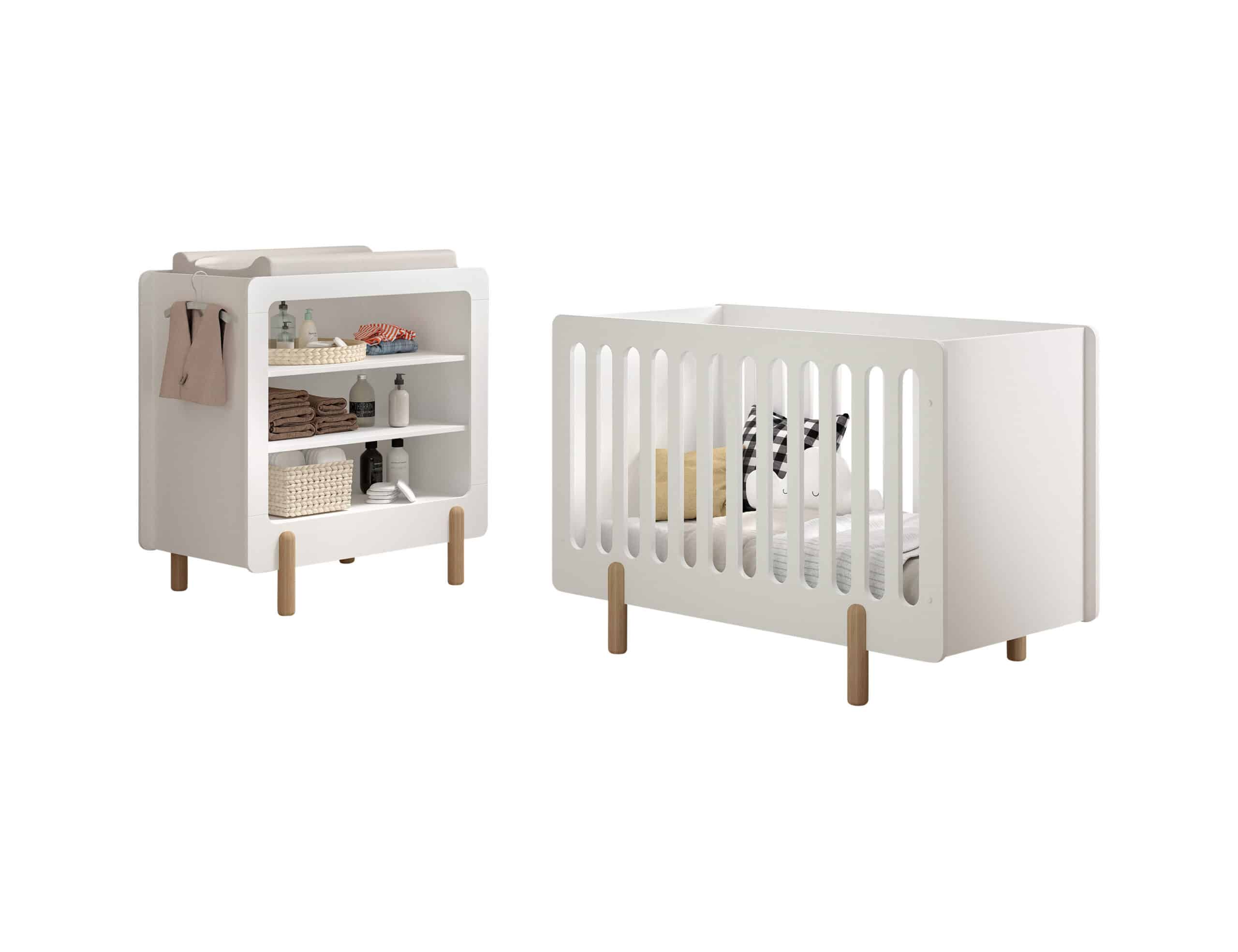 Het SMILE babybed (60 x 120 cm) is zowel stijlvol als functioneel. De combinatie van de witte tijdloze uitstraling en de ronde poten in natuurhout past in elke babykamer. De stevige spijlen en verstelbare bodem houden rekening met de veiligheid en groeimogelijkheden van je baby. De verzorgingstafel beschikt over 3 open legplanken die voldoende opbergruimte bieden voor essenti�le items. Het is een ideale toevoeging aan elke ruimte die een duurzame en aantrekkelijke oplossing nodig heeft voor verzorgingsactiviteiten of opbergbehoeften.
