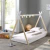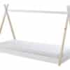 Dit bed (90 x 200 cm) van de TIPI collectie is vervaardigd uit massief grenen. Kinderen zijn dol op het speelse design. Het model bevindt zich op de grond waardoor het kind heel gemakkelijk zelfstandig in- en uit het bed kan stappen. Toch is er voldoende ruimte voor ventilatie van de matras. Versier dit bed met een leuke (licht)slinger of andere accessoires en cre�er samen het bed van zijn of haar dromen! Er is een matras inbegrepen met een dikte van 10 cm.