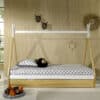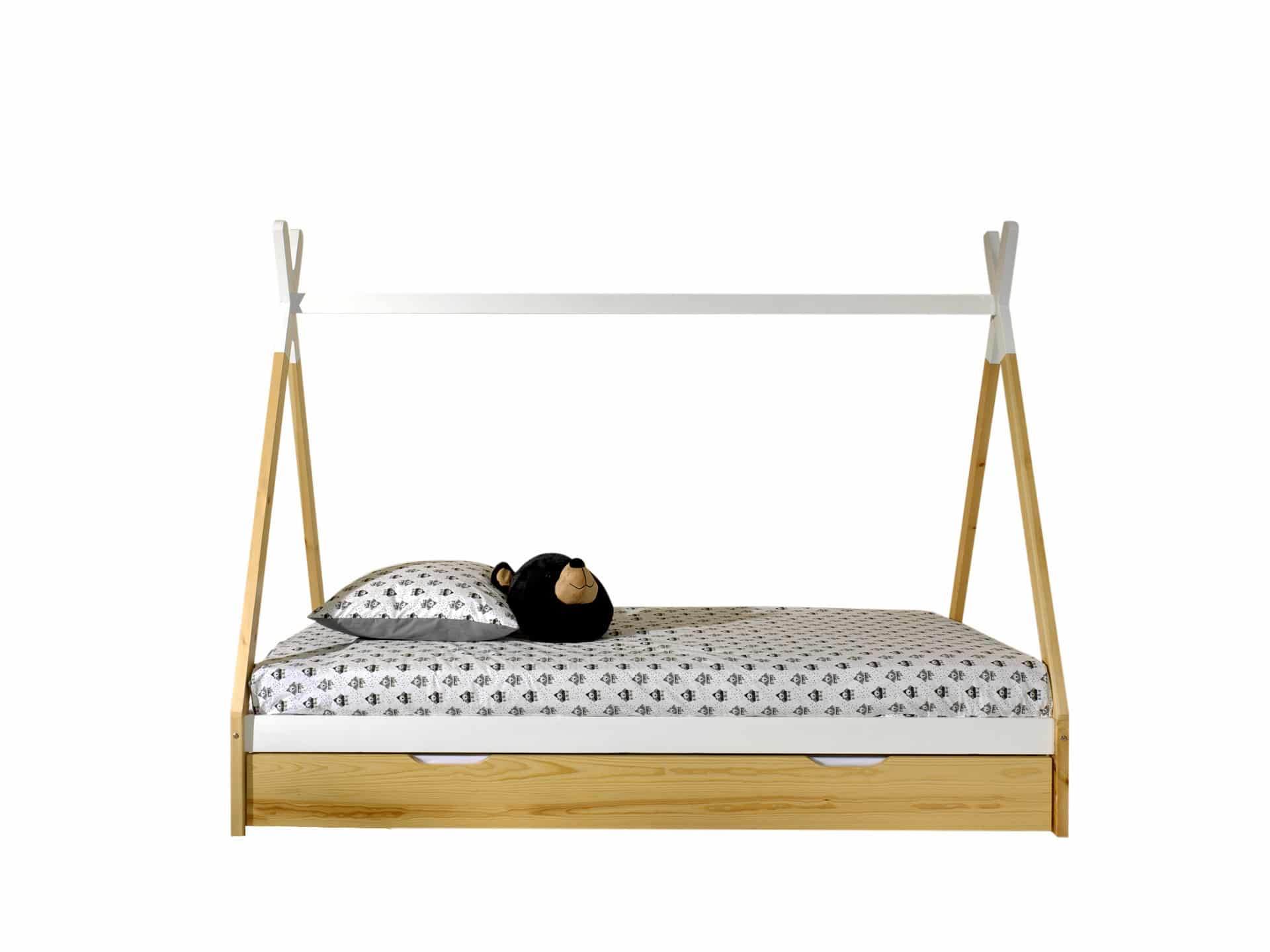 Dit bed (90 x 200 cm) van de TIPI collectie is vervaardigd uit massief grenen. Kinderen zijn dol op het speelse design. Versier dit bed met een leuke (licht)slinger of andere accessoires en cre�er samen het bed van zijn of haar dromen! Dit bed wordt gecombineerd met een natuurkleurige bedlade. Onderaan deze bedlade zijn wieltjes voorzien zodat deze gemakkelijk kan worden in- en uitgetrokken. Het biedt een extra slaapplek voor een gast maar kan net zo goed dienen als extra opbergruimte.