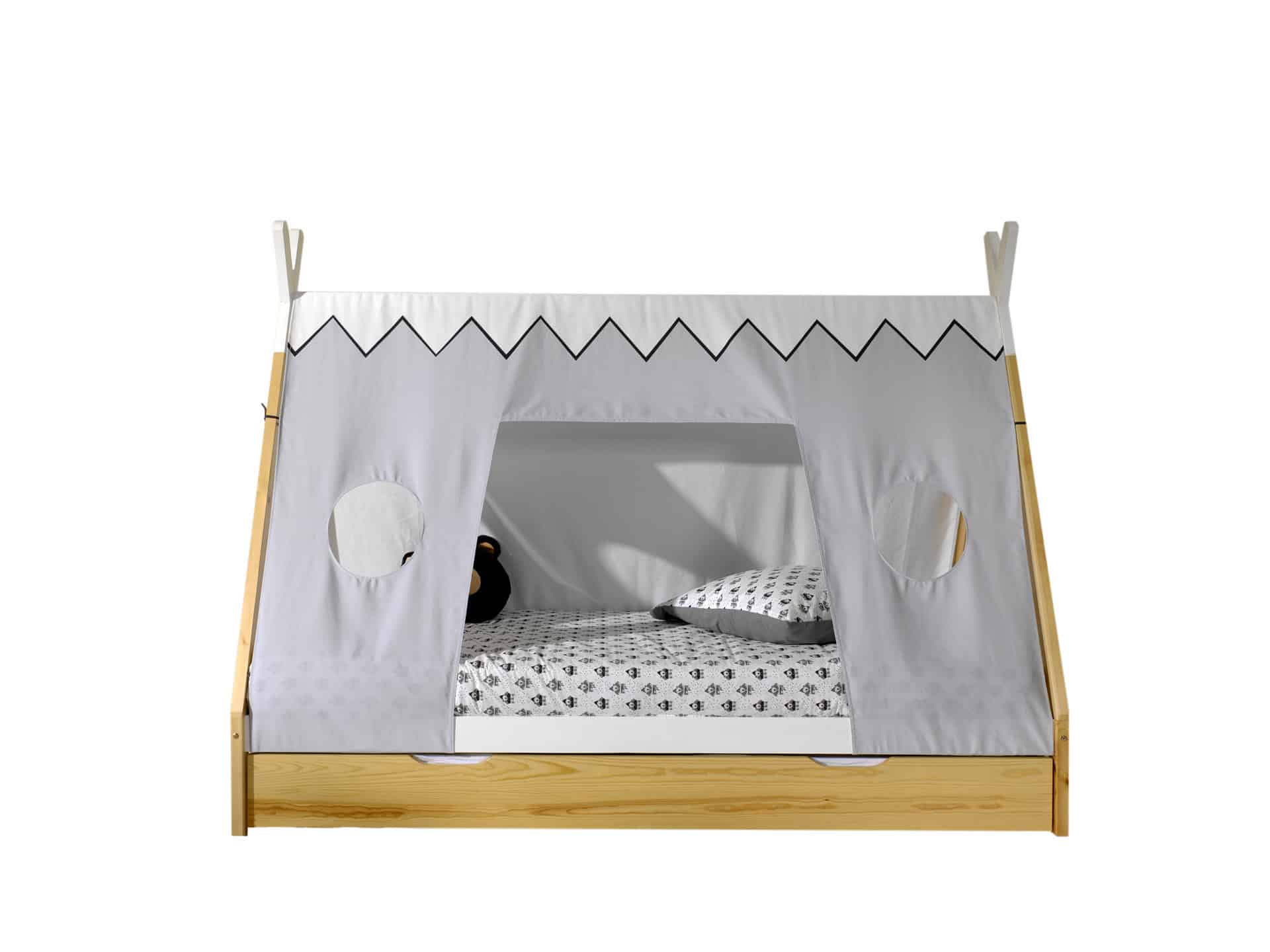 Dit bed (90 x 200 cm) van de TIPI collectie is vervaardigd uit massief grenen. Kinderen zijn dol op het speelse design. Versier dit bed met een leuke (licht)slinger of andere accessoires en cre�er samen het bed van zijn of haar dromen! Dit bed wordt gecombineerd met een natuurkleurige bedlade. Onderaan deze bedlade zijn wieltjes voorzien zodat deze gemakkelijk kan worden in- en uitgetrokken. Het biedt een extra slaapplek voor een gast maar kan net zo goed dienen als extra opbergruimte. De textielset vormt de perfecte aanvulling op dit tipi bed.