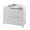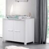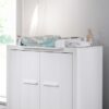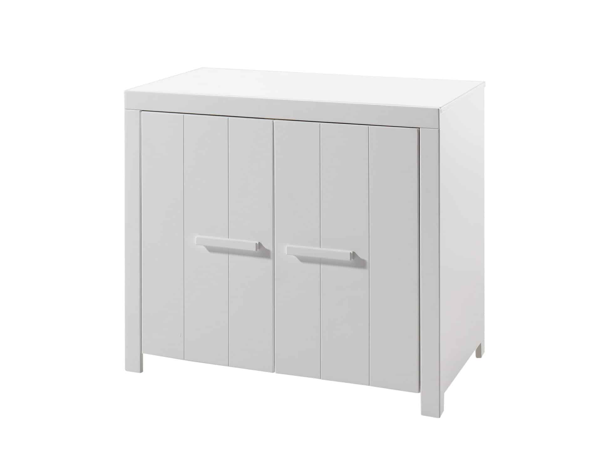 Deze commode met luierplank van de ERIK-collectie is volledig vervaardigd in een combinatie van grenen en MDF. Deze zijn witgelakt. De commode heeft 2 deuren met binnenin 1 legplank.