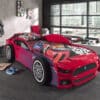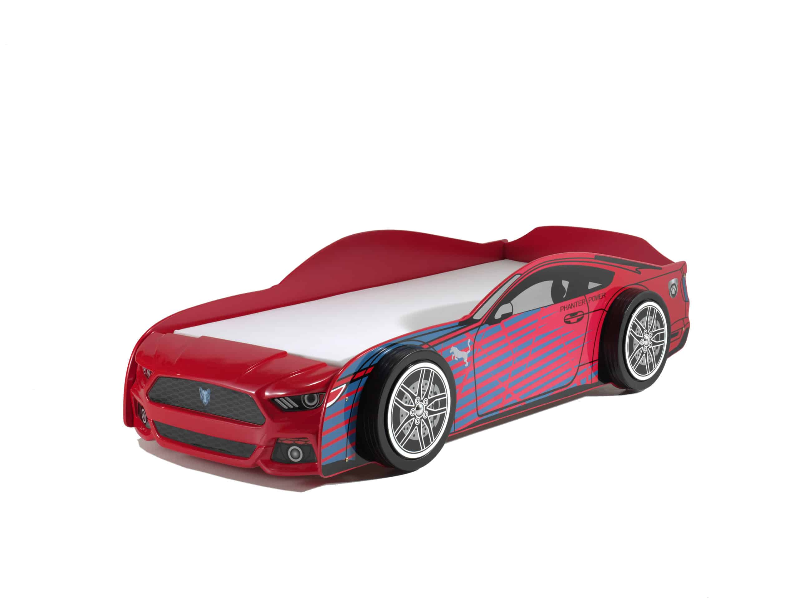 Dit PANTHER POWER CARBED is vervaardigd uit rood gelakte MDF met blauwe details. De verhoogde zijden dienen als uitvalbeveiliging. De bijhorende lattenbodem een BASIC COOL MATRAS is inbegrepen