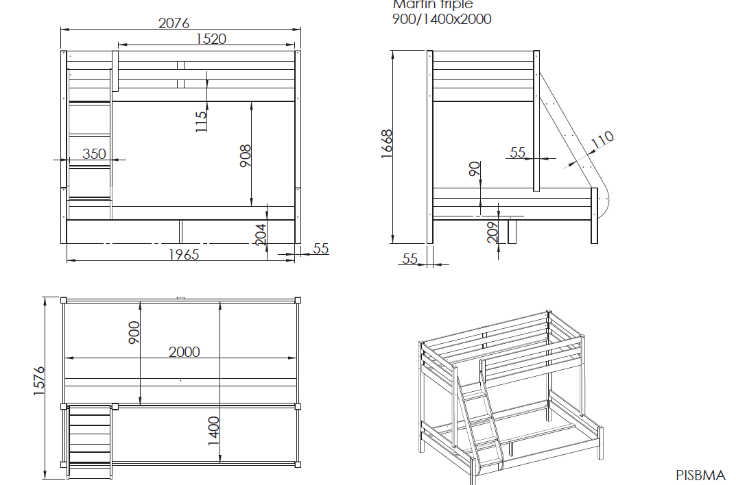 Dit familiebed van PINO is natuur gelakt en gemaakt uit Scandinavisch grenen hout. Het bovenste bed heeft een breedte van 90 x 200 cm en het onderste bed een breedte van 140 x 200 cm.